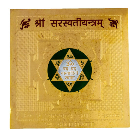 Pujahome Original Shri Saraswati Yantra - 3.25X3.25 Inch Gold Polished Spiritual Enhancer
