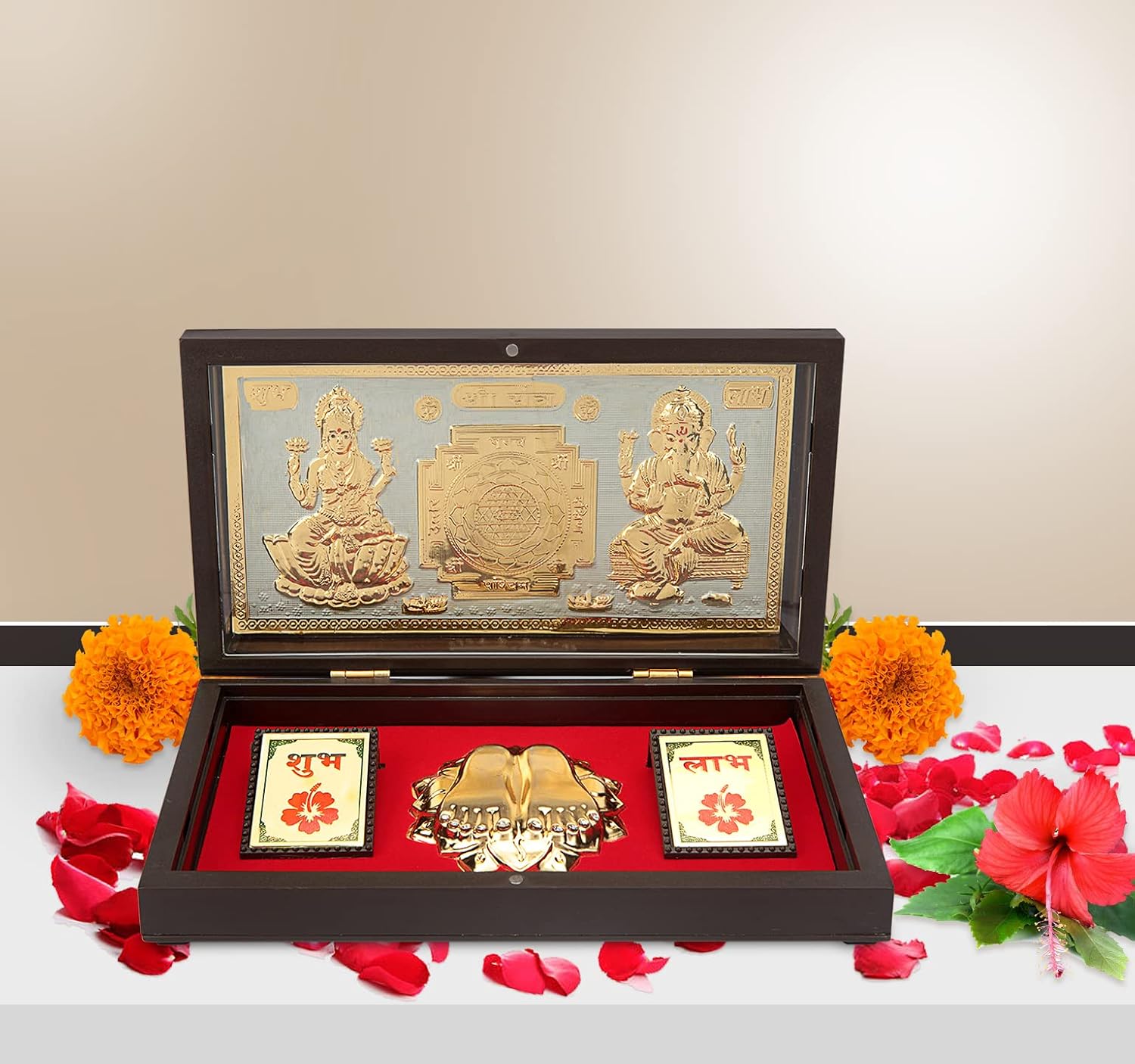 पूजाहोम 24 कैरेट गोल्ड प्लेटेड लक्ष्मी गणेश सरस्वती भगवान की मूर्ति चरण पादुका के साथ (13h X 21w X 11.5l सेंटीमीटर)