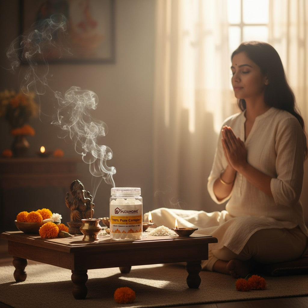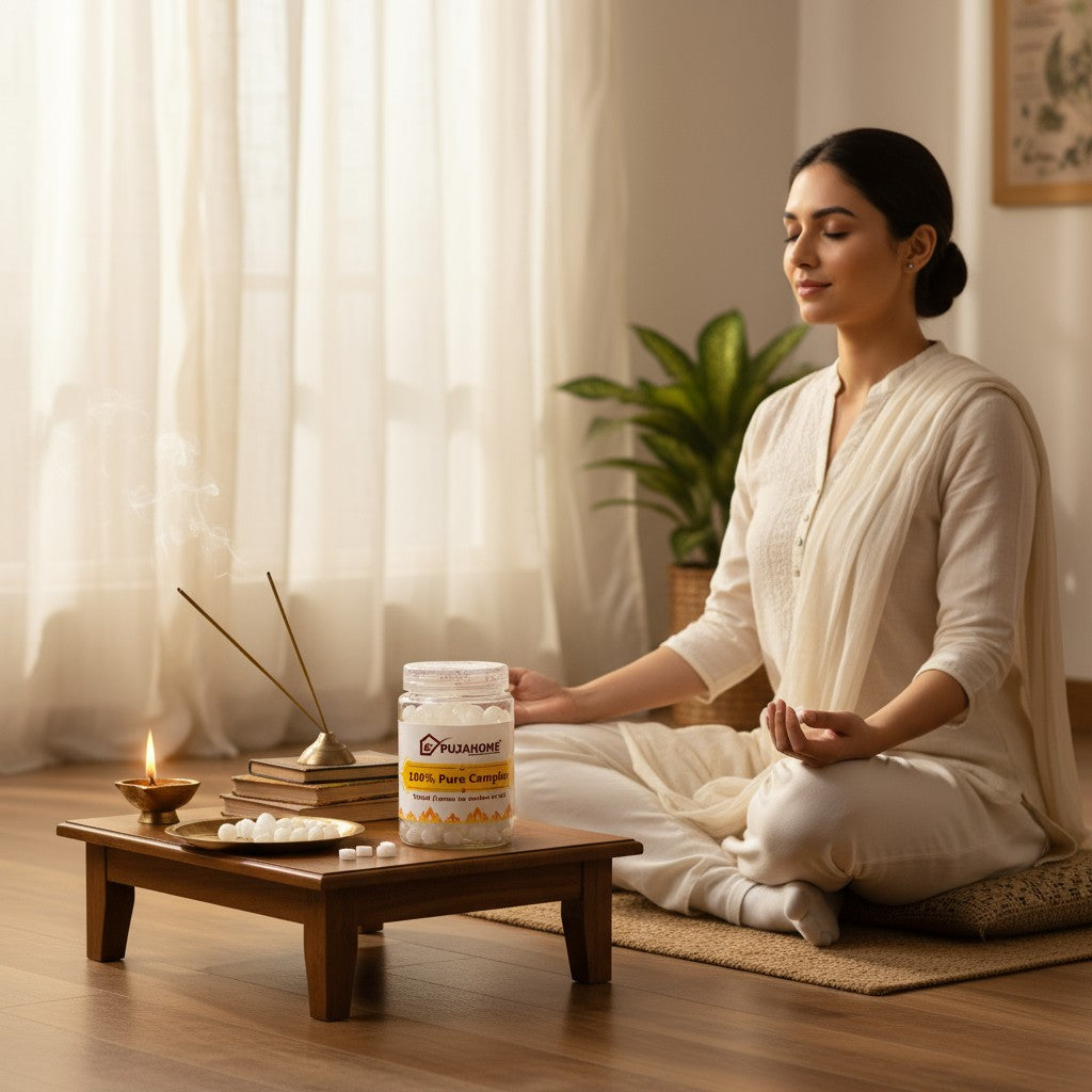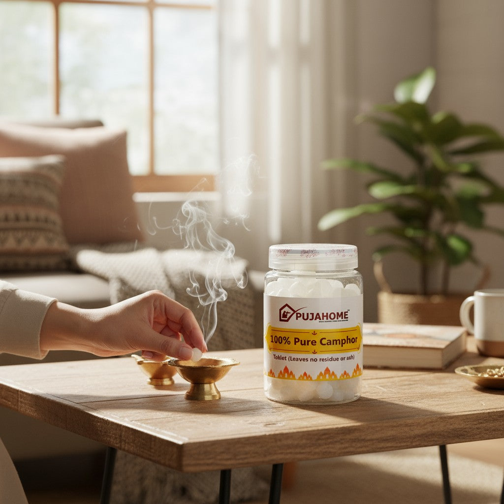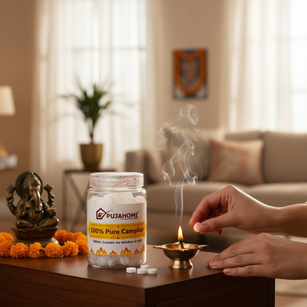Bring purity and positivity to your sacred rituals with Pujahome 100% Pure Camphor Tablets, specially made for puja, aarti, havan, meditation, and yoga. Known for its powerful cleansing and spiritual properties, camphor is an essential part of traditional worship and helps purify the environment when burned.