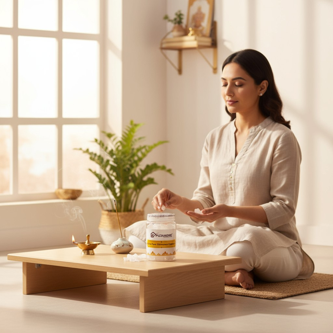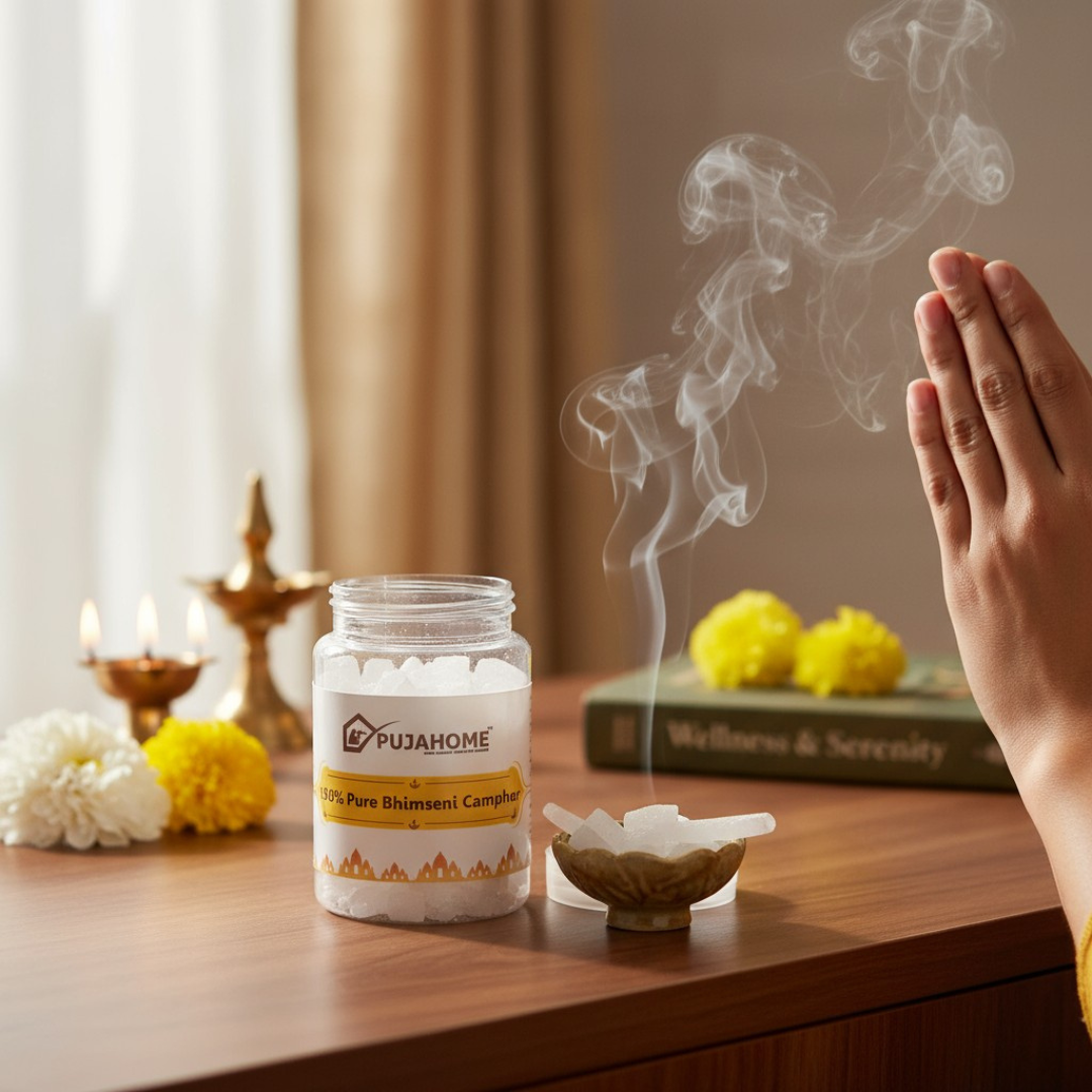 Experience the authentic purity of Pujahome Bhimseni Camphor, known for its strong, natural aroma and powerful cleansing properties. This 100% pure, organic, and original Bhimseni Kapoor is traditionally used for puja, aarti, havan, meditation, and spiritual rituals, helping create a deeply sacred and positive environment.
