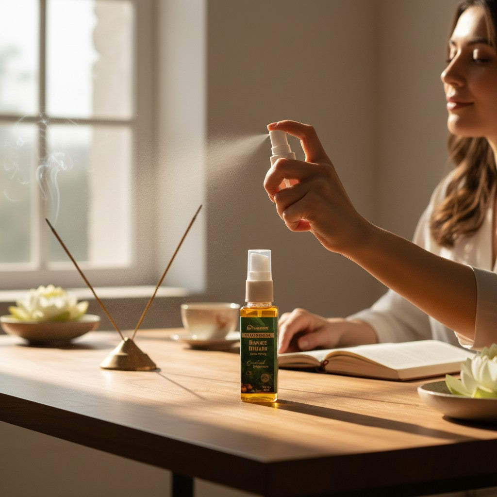 Spray lightly in the pooja area or around the room to create a serene and devotional ambience.