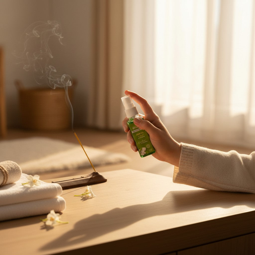 Spray lightly in the pooja area or around the room to refresh and create a peaceful ambience.