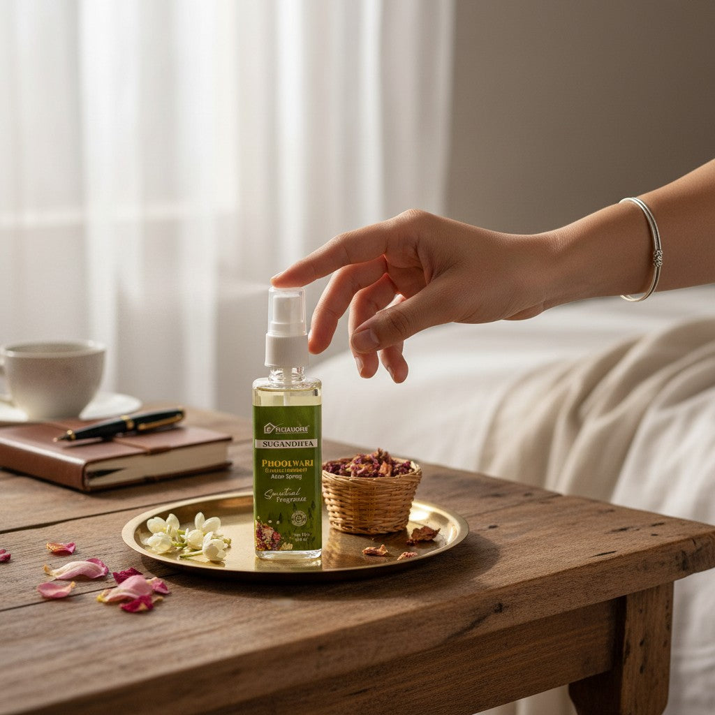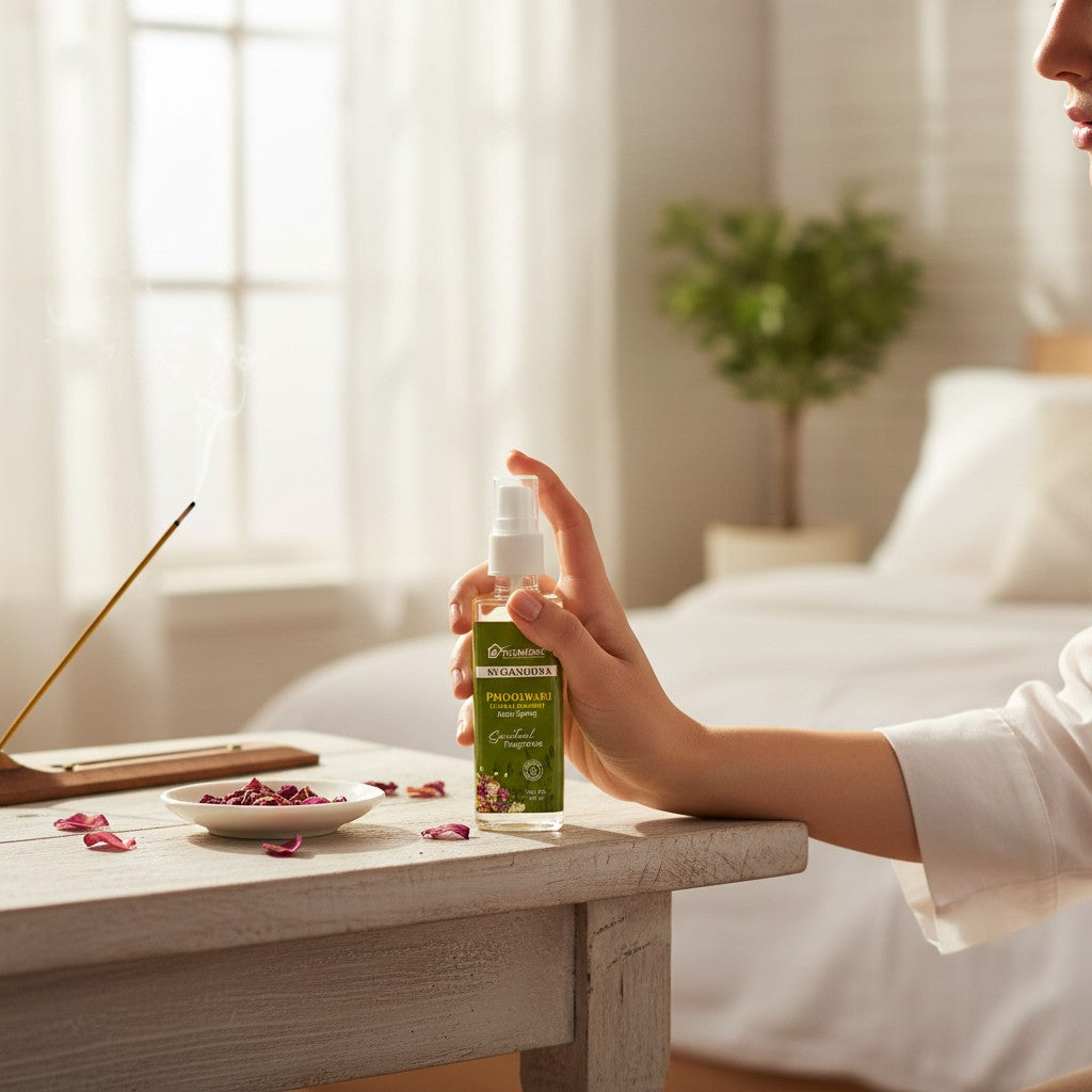 Spray lightly in the pooja area or around the room to create a fresh and devotional atmosphere.