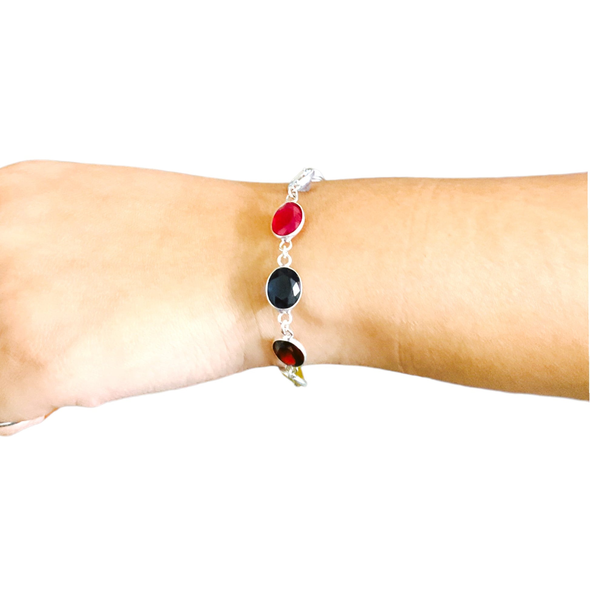 The Navratna stones featured in this bracelet include Ruby, Pearl, Coral, Emerald, Yellow Sapphire, Diamond, Blue Sapphire, Hessonite, and Cat's Eye. Each stone is associated with a specific planet and possesses unique metaphysical properties believed to influence various aspects of life such as health, wealth, love, and success.