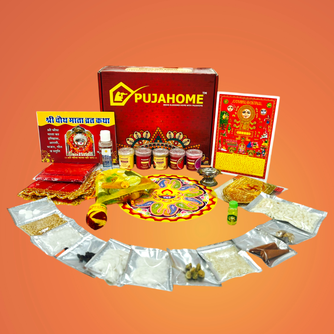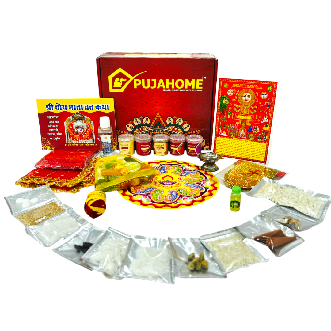 Celebrate the timeless tradition of Karwa Chauth with the comprehensive Pujahome Karwa Chauth Puja Samagri Kit. This meticulously curated set ensures you have all the essentials for a spiritual and authentic Karwa Chauth observance, from honoring Chauth Mata to beautifying oneself with NavShringaar Saman.