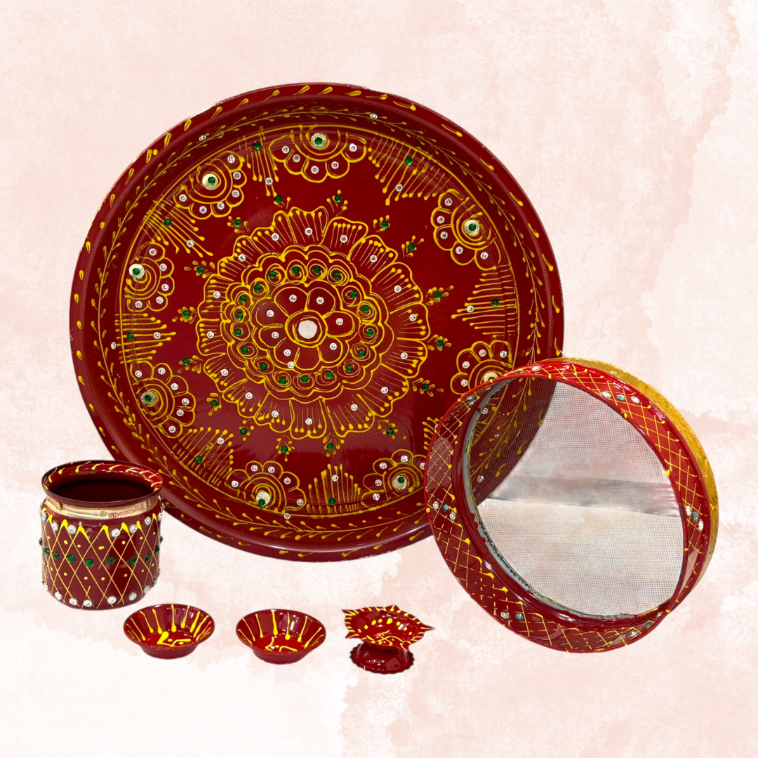 Pujahome Karwa Chauth Puja Samagri Kit With Thali Set (30+ Items) + Thali Set(6Pc Set - Meenakari Design)