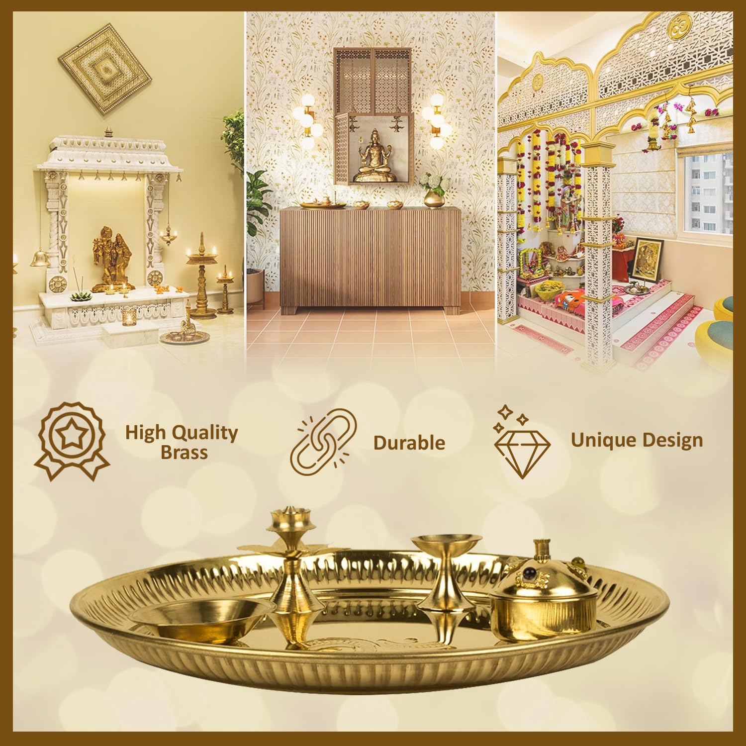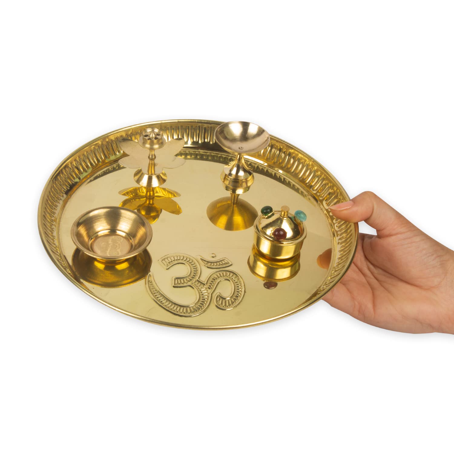 Pujahome Om Engraved Puja Thali Set with Agarbatti Holder, Aarti Diya, Akshat Holder and Kumkum Holder (8 Inch, Gold)