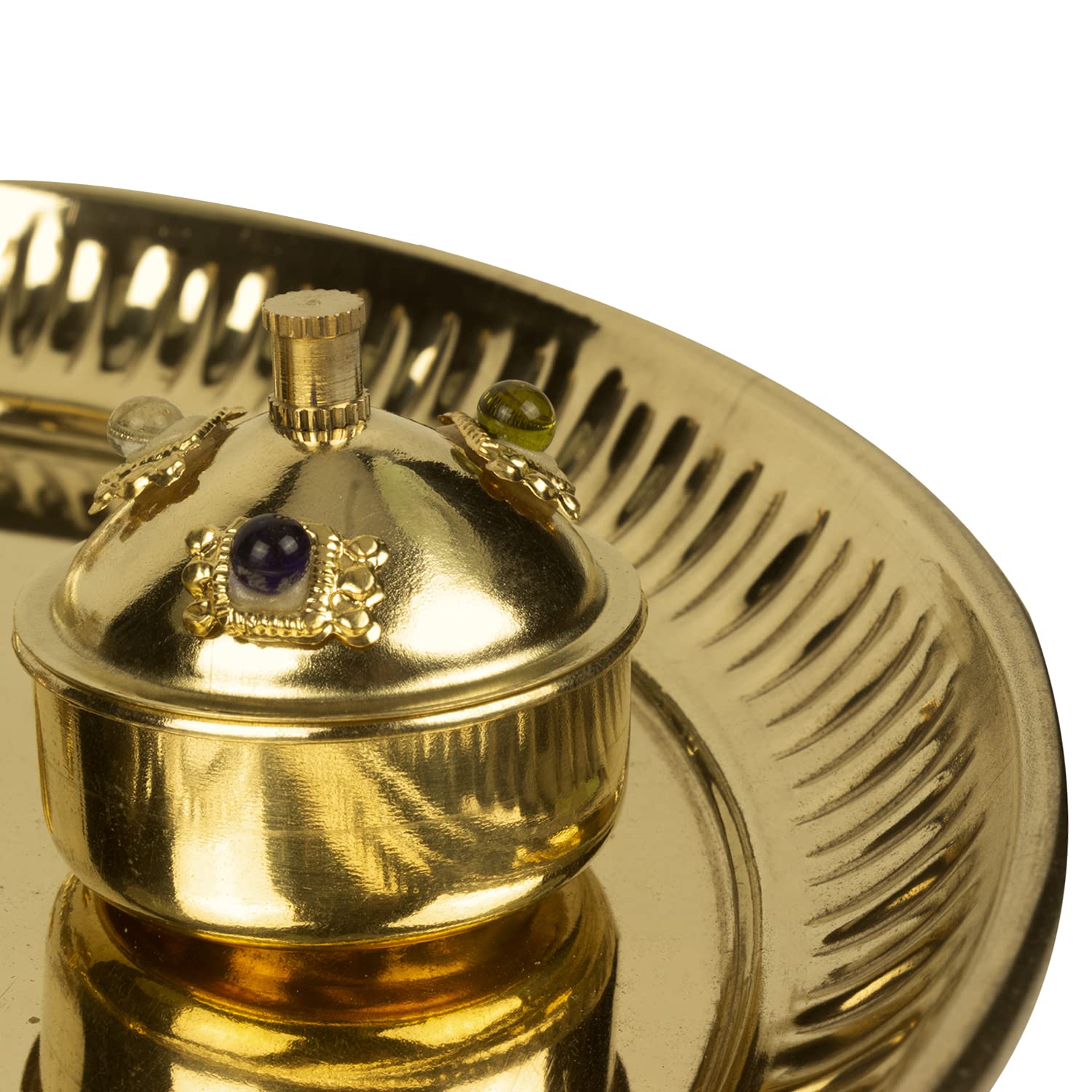 The set includes an exquisitely designed agarbatti holder for burning incense, creating a fragrant atmosphere that complements your prayers. The aarti diya, essential for performing aarti during your rituals, is crafted to hold the flame steadily and safely. Additionally, the set comes with an akshat holder and a kumkum holder, each serving a crucial role in traditional ceremonies by holding sacred rice grains and kumkum (vermilion), respectively.