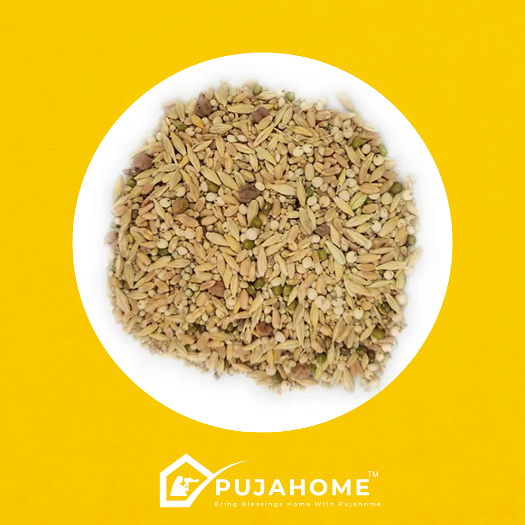Crafted with utmost care and reverence, Pujahome Saptdhan features a harmonious blend of seven auspicious grains and seeds, each chosen for its unique properties and significance in Hindu culture and spirituality. From the purity of rice to the fertility symbolized by wheat, from the grounding energy of barley to the nourishment embodied by lentils, each component plays a vital role in invoking blessings and divine favor.