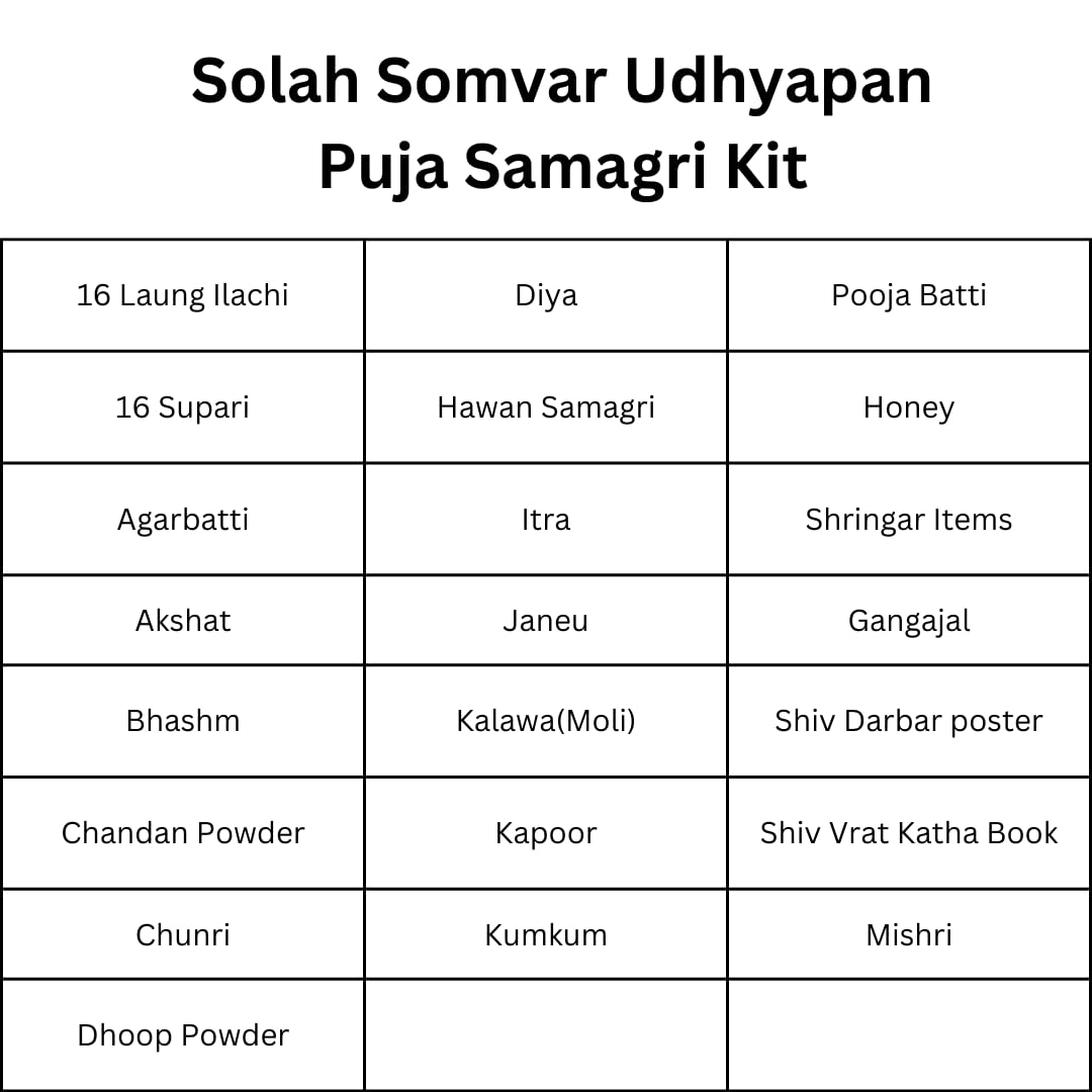 - All-Inclusive Kit: Contains all essential items for the Solah Somvar Udhyapan Puja, ensuring a complete and authentic ritual experience.